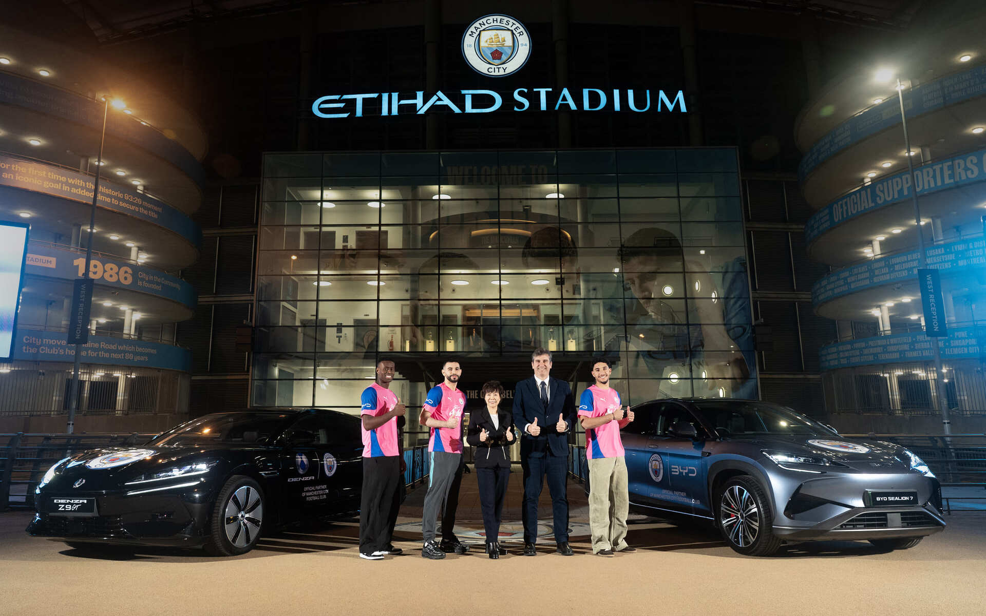 Οι Haaland, Donnarumma και Cherki φωτογραφήθηκαν με τα BYD Sealion 7 και Denza Z9 GT, μπροστά από το προπονητικό κέντρο της Μάντσεστερ Σίτι, σηματοδοτώντας την έναρξη συνεργασίας με το BYD Group.