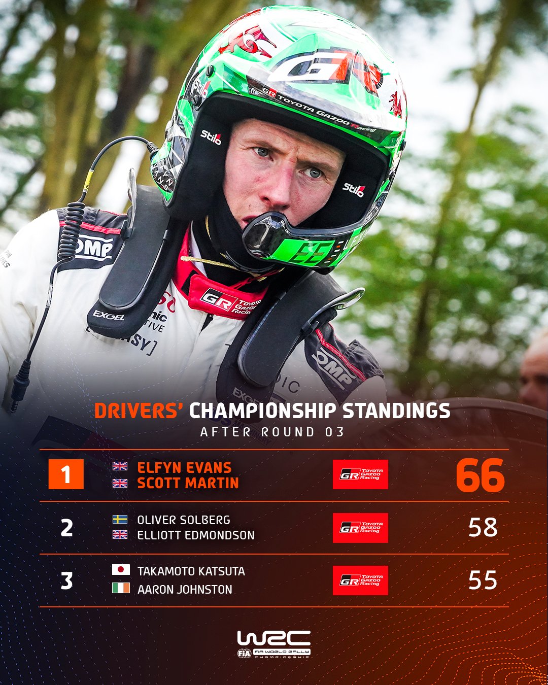 Στη βαθμολογία ο Evans διατηρείται στην κορυφή, με τους Solberg και Katsuta να ακολουθούν.