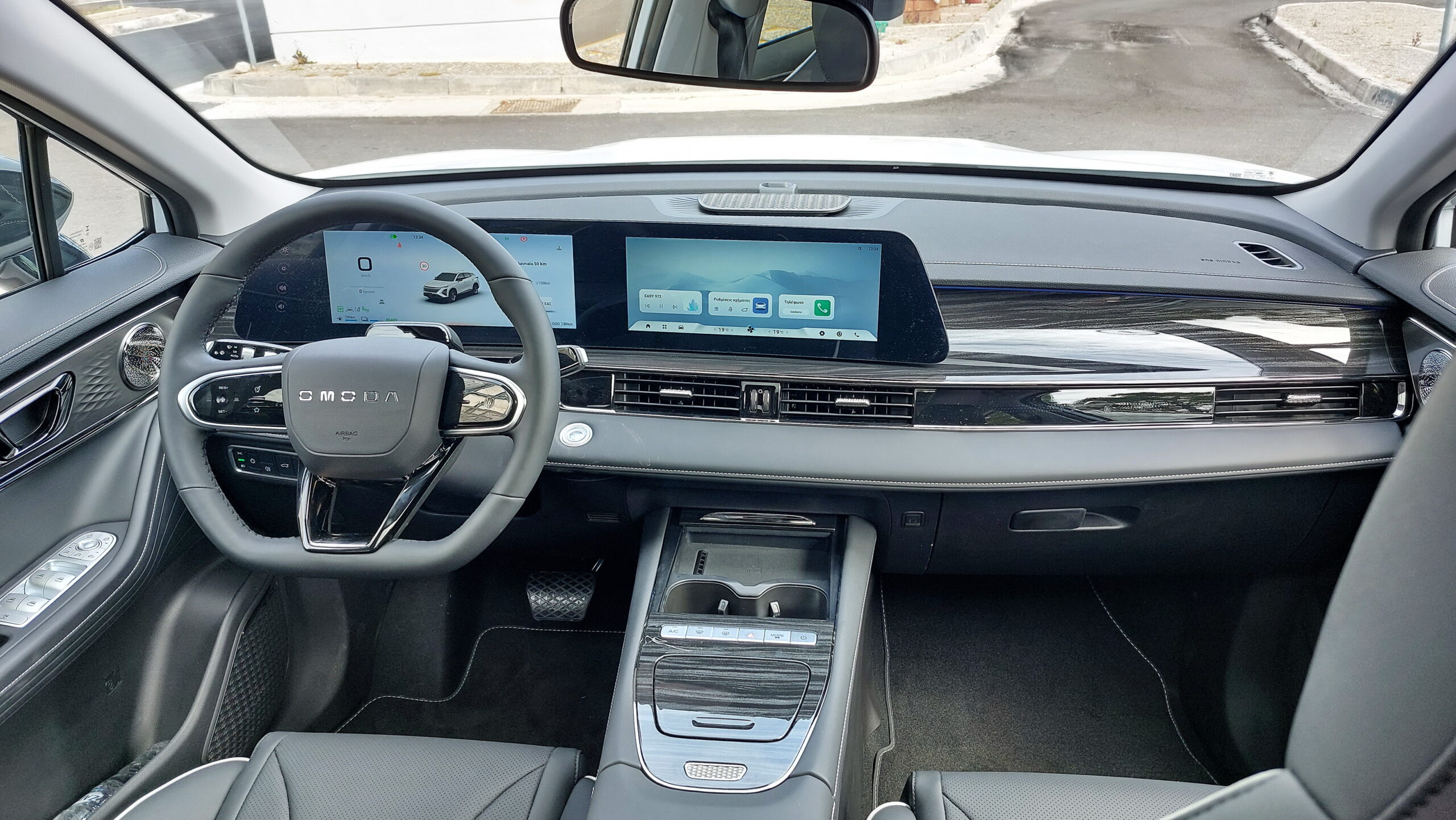 Η καμπίνα του υβριδικού ελάχιστα διαφέρει από το ηλεκτρικό OMODA 5. Αυτό σημαίνει πως, αν και έχουμε να κάνουμε με ένα πολύ προσιτό αυτοκίνητο, η εικόνα και τα υλικά παραπέμπουν σε κάτι αισθητά πιο ακριβό. Μαλακά πλαστικά καλύπτουν το μεγαλύτερο μέρος της καμπίνας, ενώ στο ταμπλό κυριαρχούν οι δύο μεγάλες οθόνες.