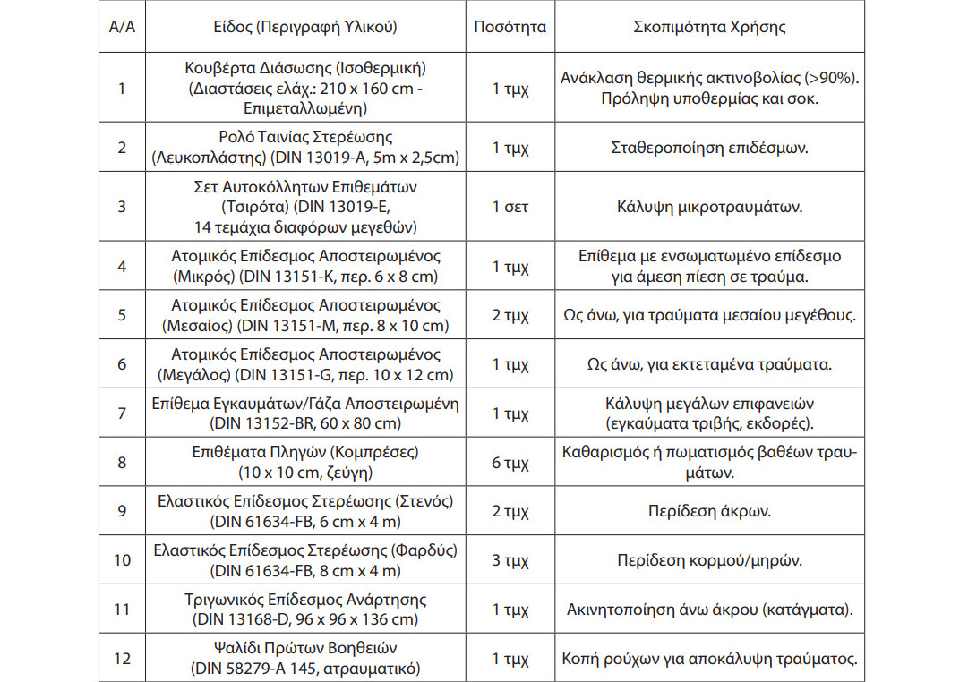 - Όλα τα υλικά πρέπει να είναι εντός της ημερομηνίας λήξης τους και σε καλή κατάσταση. Τα αποστειρωμένα υλικά (γάζες, επίδεσμοι) φέρουν ημερομηνία λήξης της αποστείρωσης (συνήθως 5 έτη).
